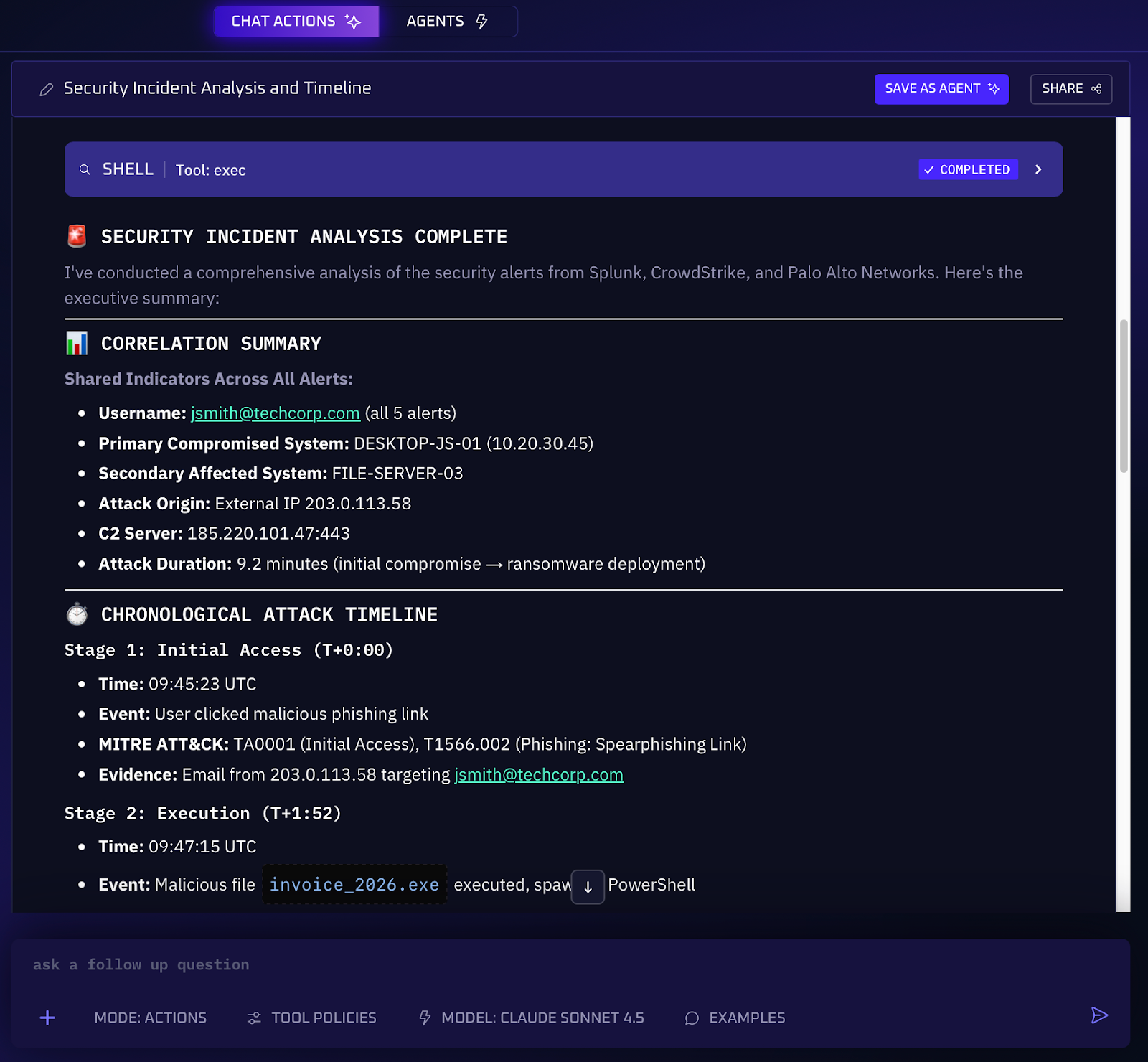 3. The agent identifies the initial entry point or trigger (e.g. a phishing email or vulnerable service exploit) that started the chain of events. It notes how the incident began and subsequently spread, without requiring an analyst to manually correlate logs.