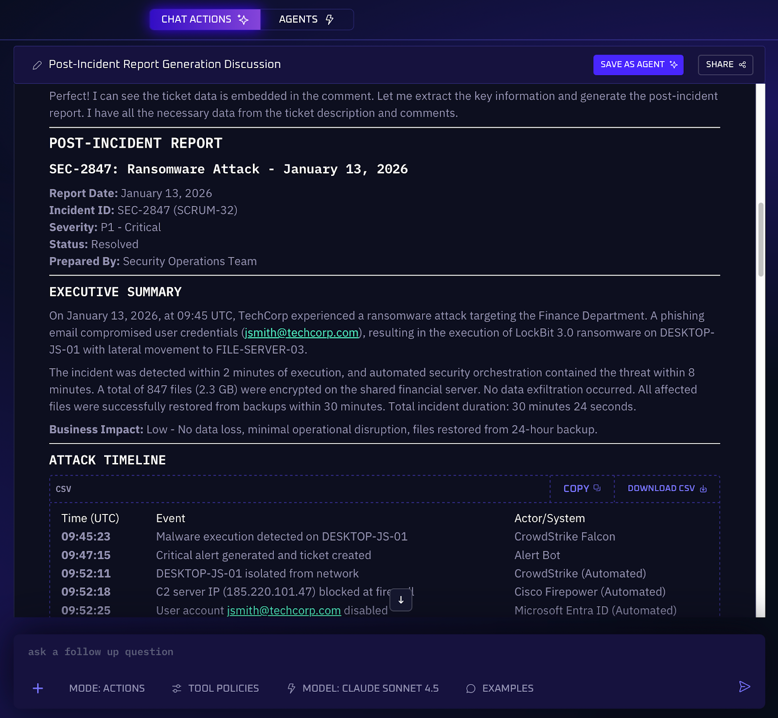 After the firefight of an incident is over, teams face the tedious (and somewhat less exciting) work of evidence collection and reporting. This usually means pulling log excerpts, copying analysts' notes, documenting what was done and when, and compiling all of that into an incident report or ticket update. It’s a task for compliance and learning purposes, but it’s often viewed as grunt work and can be error-prone if rushed. Here, an AI workflow shines by handling the entire post-incident documentation process. The agent can compile all relevant artifacts and conversations and produce an audit-ready report that describes what happened, what actions were taken, and why. This results in more time saved, as well as comprehensive and standardized reports.