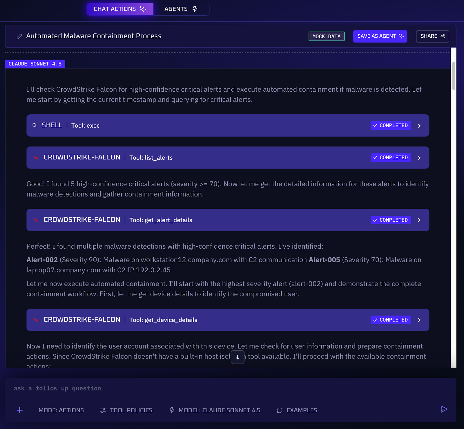 1. The workflow kicks off when a high-confidence incident is identified, for example, a validated malware infection or an analyst issuing a containment command via the AI assistant.