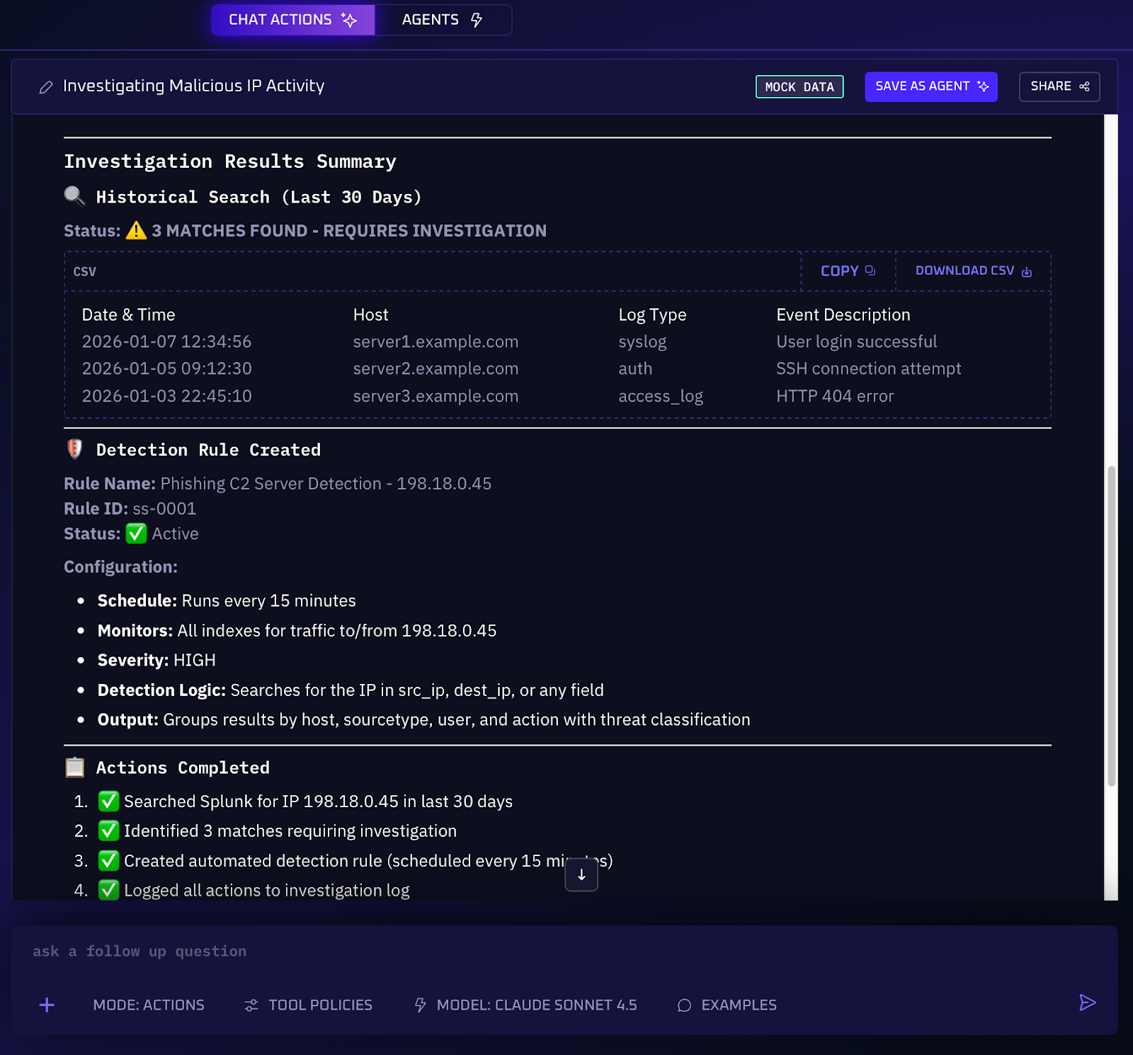 4. As it builds the timeline, the AI layers on context, which hosts or user accounts were affected, what data might have been accessed or exfiltrated, so the scope and impact are evident. It may map actions to MITRE ATT&CK tactics to describe the adversary behavior.