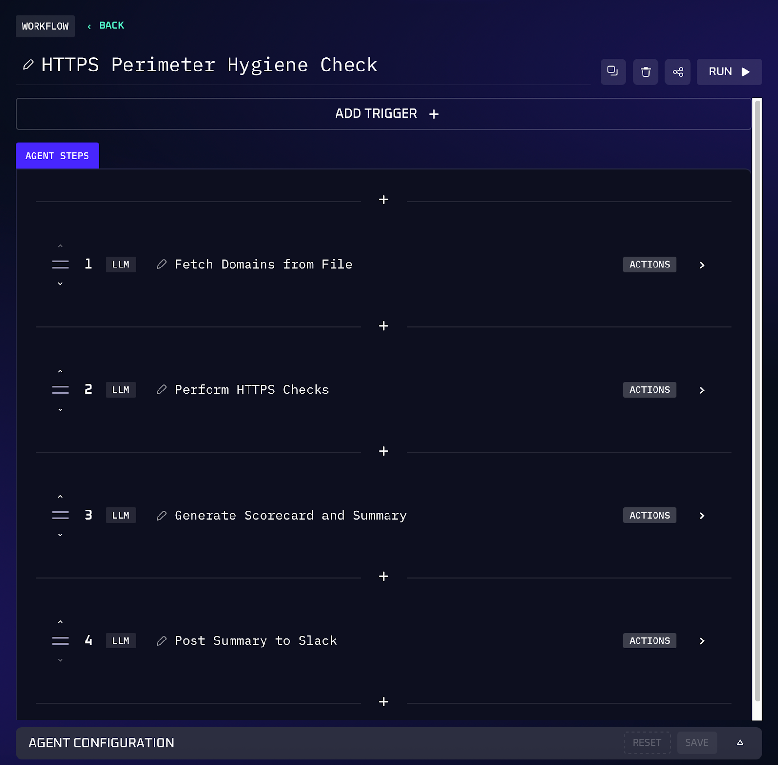 This workflow provides a continuous scorecard of your domains’ HTTPS security posture by directly analyzing their response headers. You supply a list of domain names, and the AI agent checks each one in turn. Each domain is then given a clear score out of 100 based on a simple baseline weighting these controls. The agent compiles a report showing each domain’s score and which headers are missing or weak for those that didn’t meet the standard.