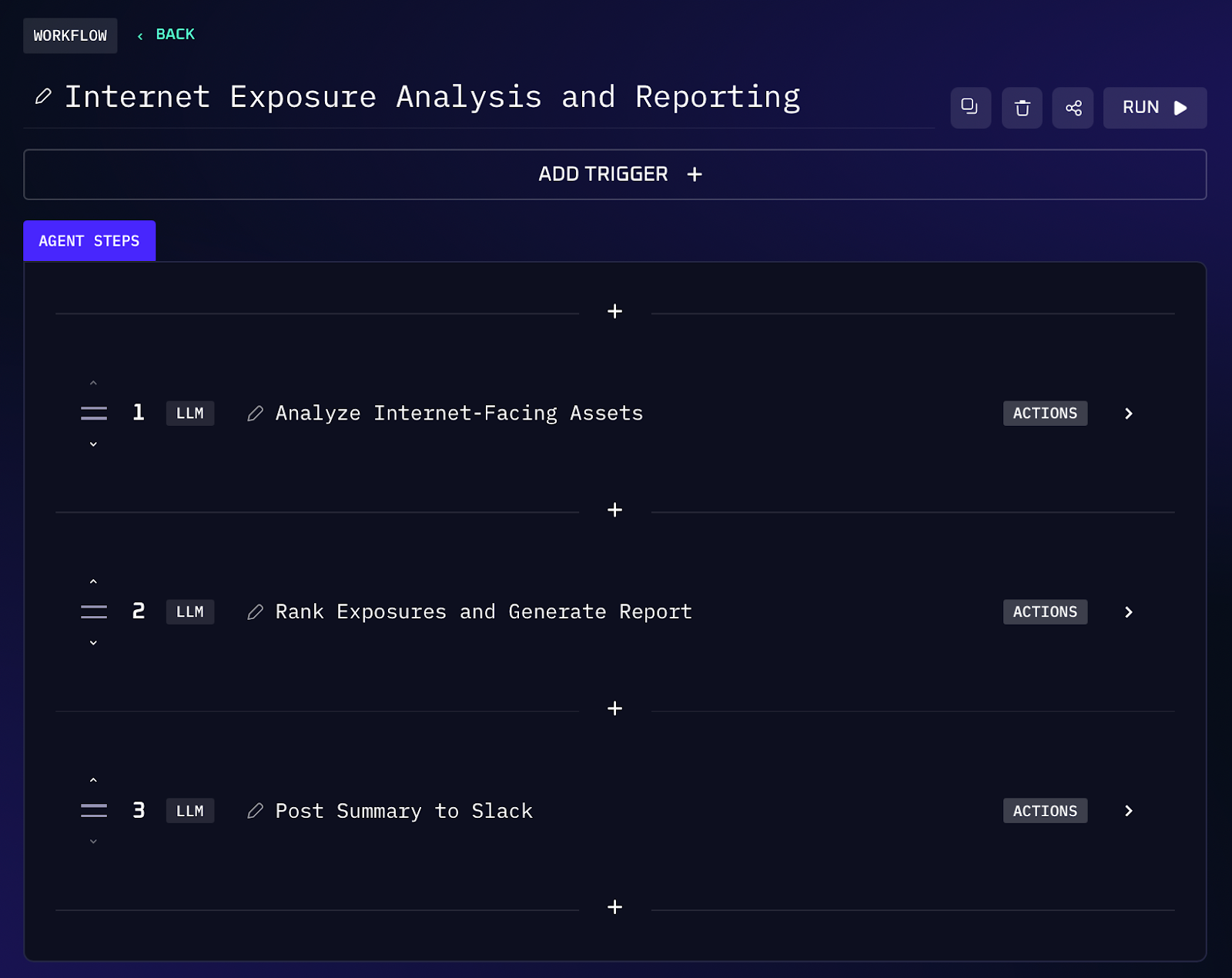 This AI workflow consolidates all that attack surface data and automatically shows the worst risks. You might start with an input like a list of internet-facing assets or a recent scan export. The agent parses the inventory and flags obvious issues. It cross-references service versions with known vulnerabilities, so if a server is running a version with a critical CVE, that gets elevated in priority. The output is a clear list of exposures (each annotated with why it’s risky), along with an executive summary of the overall external risk posture.