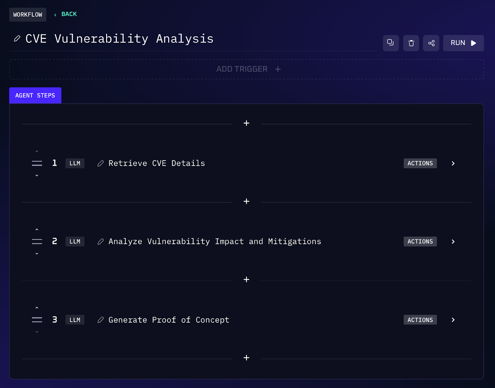1. The agent takes a user specified CVE identifier (e.g. CVE-2023-1234) along with a callback IP address and port. It first queries a vulnerability database or knowledge base to gather details on that CVE, such as the affected software, version, and the nature of the flaw (e.g. SQL injection, buffer overflow, remote code execution).