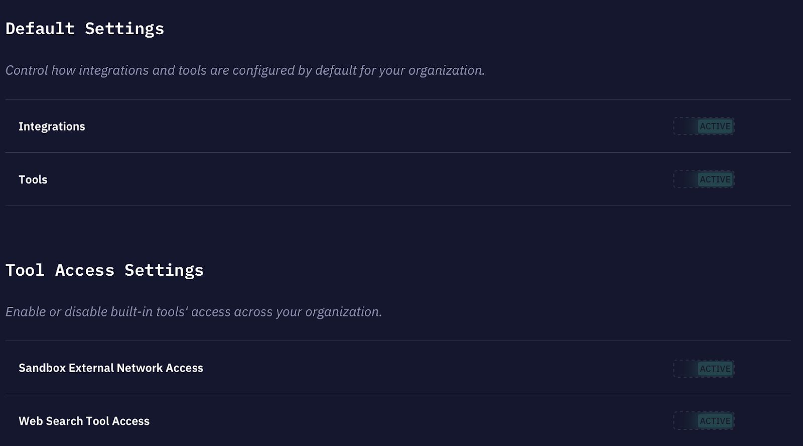 These defaults mean new agents start in a controlled state. Teams can be granted exceptions through role-based policies, but the security posture is established at the organization level, not left to individual users.