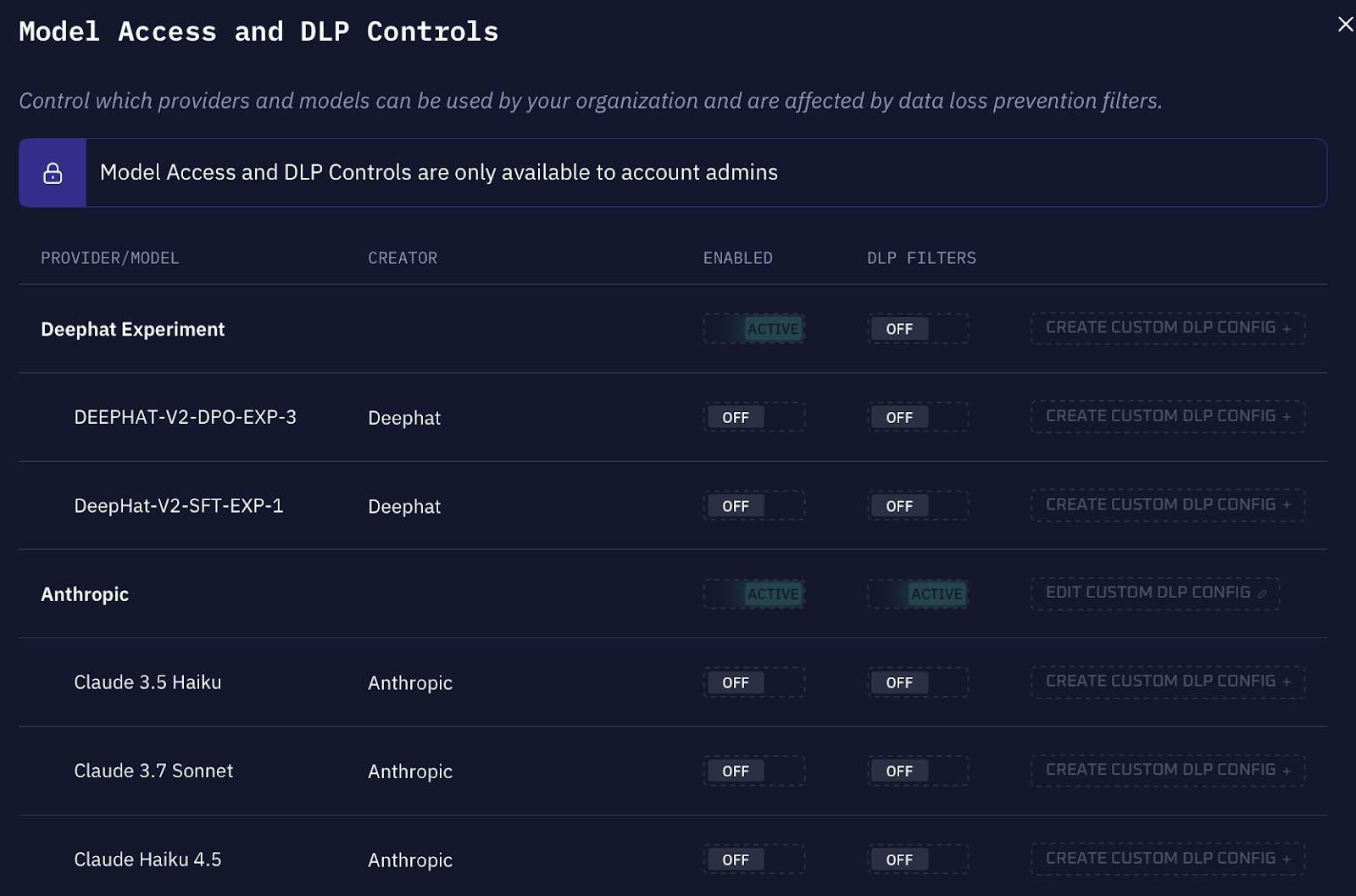 Something else to note is that not all models are appropriate for all use cases. The admin portal gives administrators control over which LLM providers and specific models are available, and whether DLP filters apply to interactions with those models.