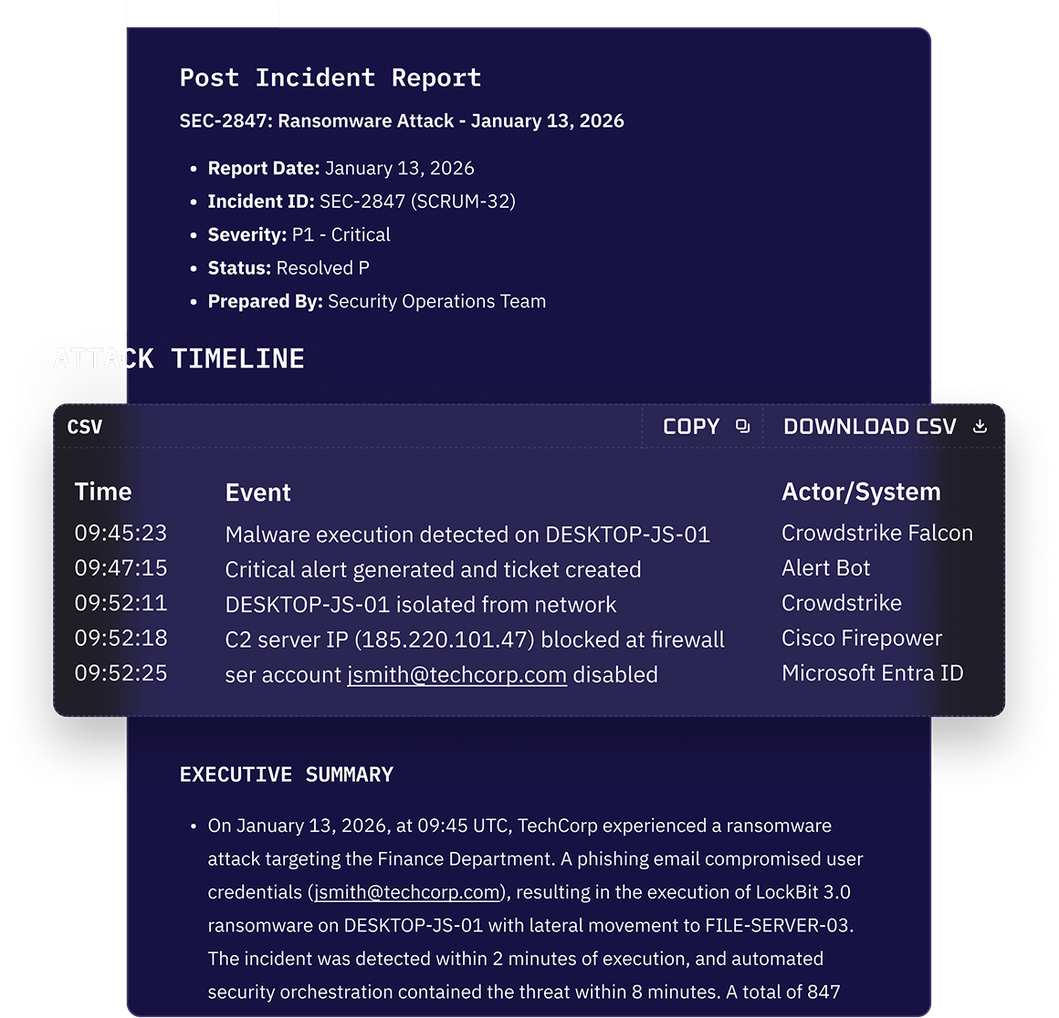 Kindo’s AI agents automatically correlate alerts, logs, identity events, and infrastructure signals into a coherent incident narrative. Related activity is stitched together into a timeline that shows entry point, blast radius, and impact without requiring analysts to manually query multiple tools.Analysts validate and escalate with confidence, backed by a complete picture of the incident and its progression.